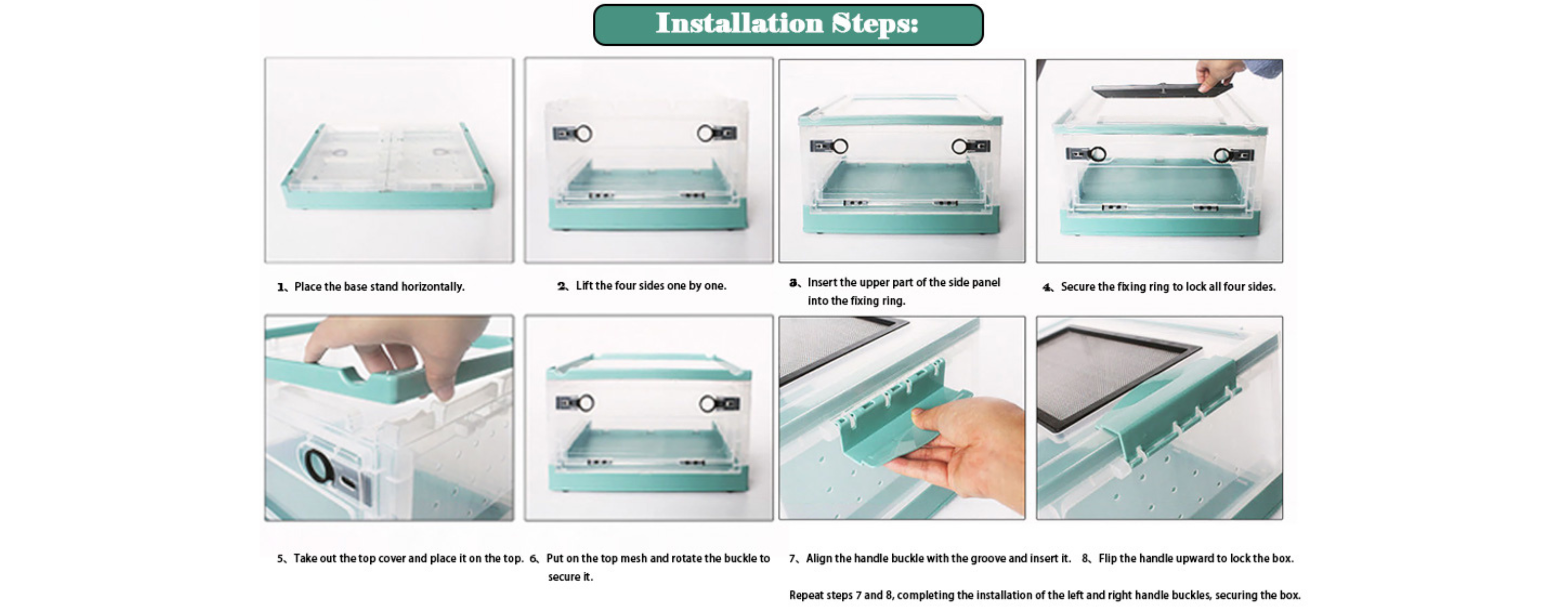 - Note: 5mm ventilation holes; secure all openings to prevent escape. Lid has 2 clasps, mesh has swivel lock, side panels have 2 ring locks.